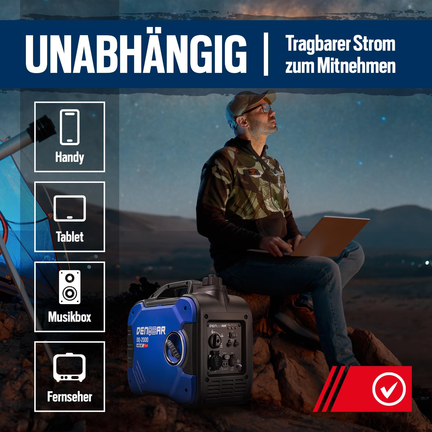 DENQBAR Inverter Stromgenerator DQ-2000 2000W Benzin Stromerzeuger mit 230V, USB Fast-Load, Superleise, 4-Takt Motor, tragbar - Für Camping, Outdoor, Baustelle, Reise, Wohnmobil und Notstromaggregat