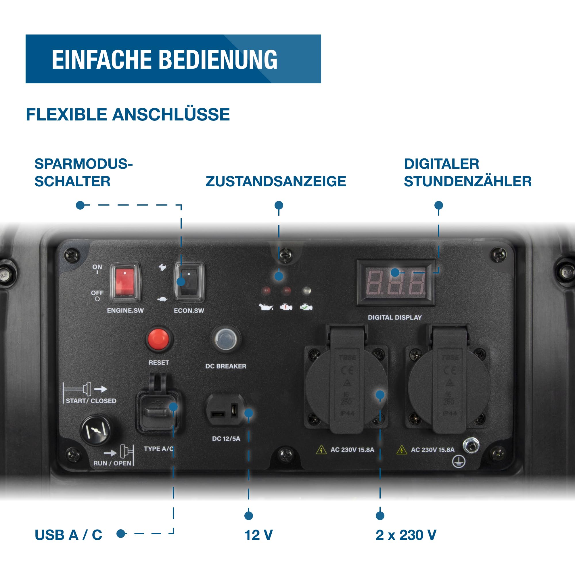 - Der Generator verfügt über einen 230V-Anschluss, einen 12V-Ausgang sowie USB-Anschlüsse (Typ A und C) zum Laden von Smartphones, Tablets und anderen USB-Geräten.